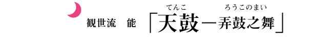 世阿弥作の唐物の能。後漢の時代、天から降ってきた鼓を持つ少年「天鼓」は、その鼓を打ちならし見事な音をだす。帝はこれを聞きその鼓を無理やり召し上げ、天鼓を呂水の川底に沈めてしまう。それ以来鼓は音を出さなくなってしまった。父親王伯が宮殿に呼び出され鼓を打つと絶えなる音が出た。帝は非を詫びて呂水のほとりで管弦の弔いを行うと、天鼓の亡霊が現れ愛用の鼓に戯れて打ち鳴らし舞遊ぶ。やがて夜明けと共に天鼓は消えうせる。前半の親子の情愛の深さ、悲しみと喜び、後半は少年が舞う有様を躍動的に見せる。「弄鼓之舞」の特別演出により、後半は鼓を弄し、狂わんばかりの少年の姿が美しく描かれる。